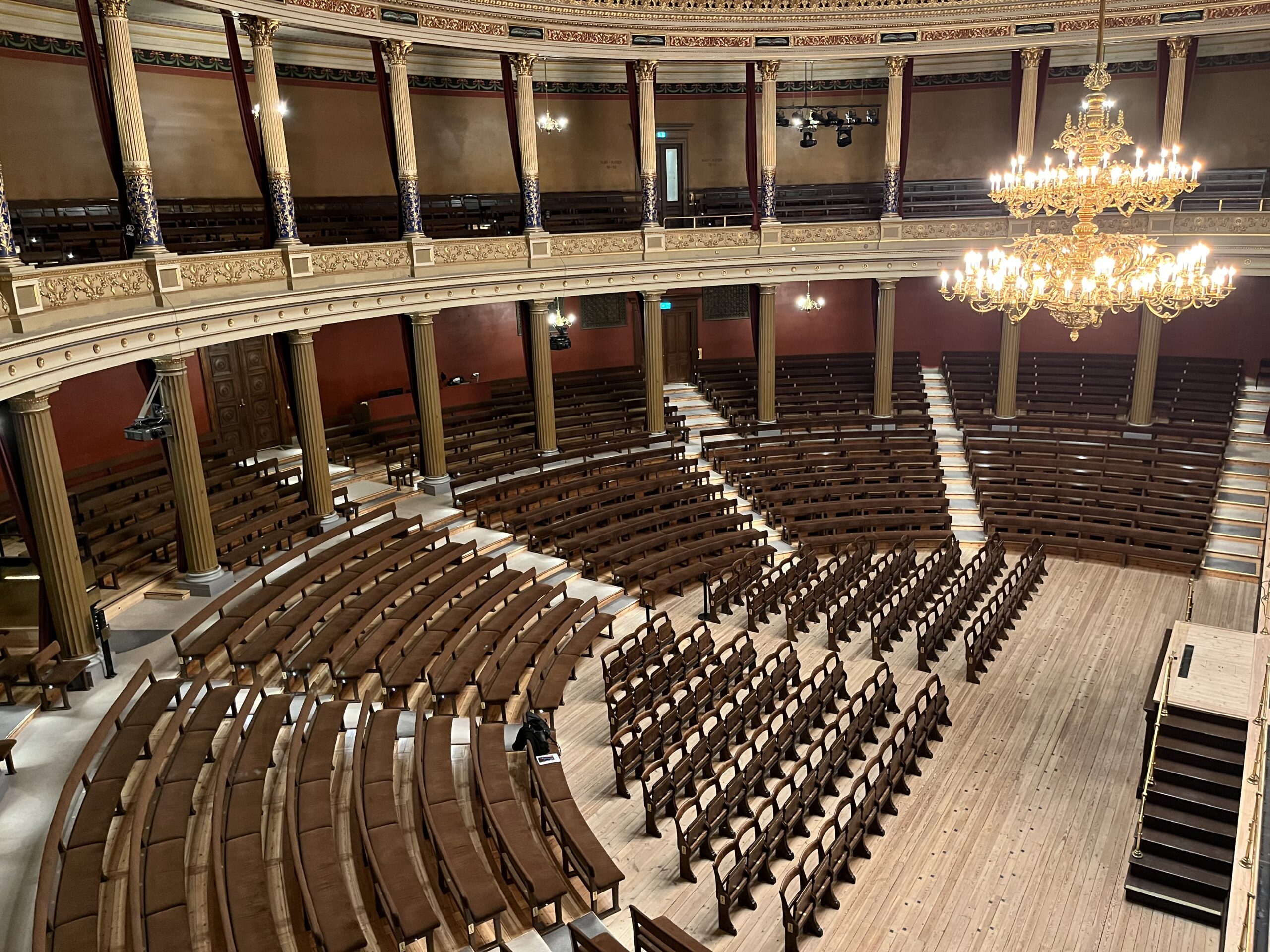 Stolsinredningen i aulan är till större delen ursprunglig och består av klaffstolar på parketten och bänkar i det halvrunda galleriet och på balkongen. Viss omdisponering av bänkinredningen och klädsel har gjorts genom åren.